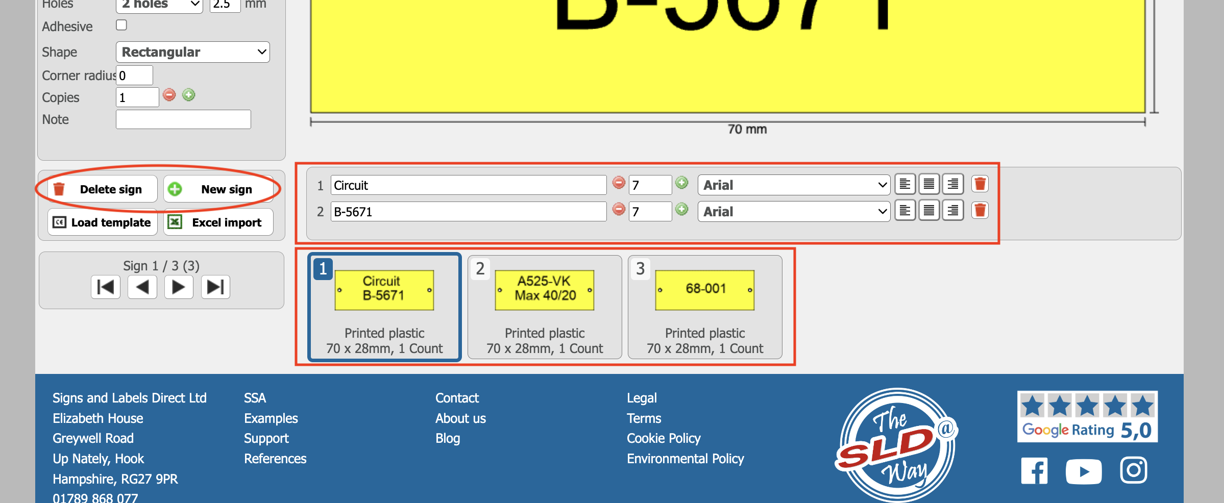 Below the sign, you will find all the text fields – one for each text box on the tool. Here you can enter text and change the size and font.