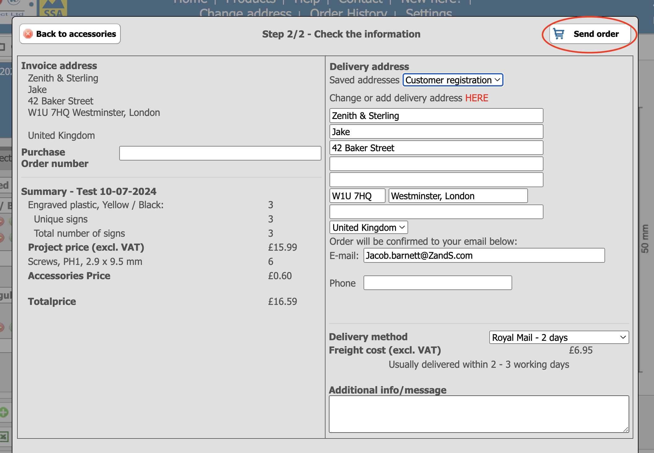 In the next step, review your order, fill in the purchase order number if required and enter your address, contact details and any other information. Then click on Send order to finalise your order.